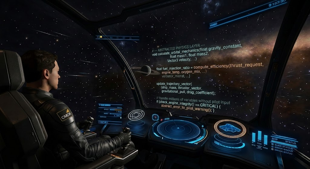 Instead, it abstracts all that complexity. It gives you a clean interface and a ship that "just flies," letting you focus on the fun stuff, like deciding which star system to explore next or how to manage your resources. You get all the experience of being a pilot without needing a PhD in astrophysics to fly your ship. (idk just had to make elite dangerous reference)